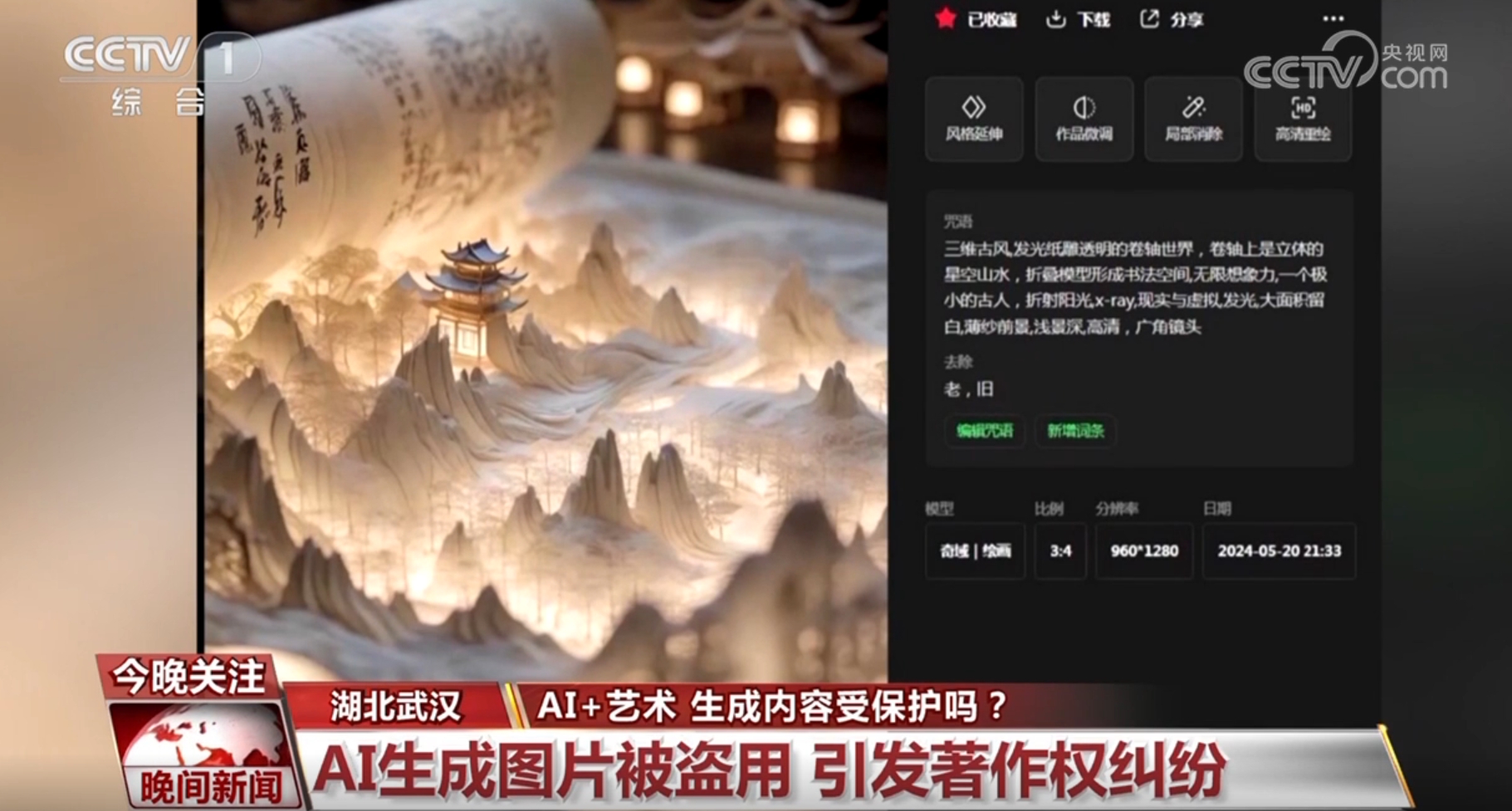 武汉东湖新技术开发区人民法院东湖科学城人民法庭二级法官 许冬冬:首先应当看原告王某输入的关键词及参数是否达到了独创性的标准;第二个是原告的创作活动和生成作品的关联性,原告在创作的时候输入了几十个关键词,比如卷轴、光影效果、远景等等,经过了几十次输出并且挑选筛选,最终获得了涉案图片。