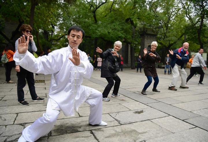 这是西安“80后”小伙赵庆(前)在小雁塔景区内向外国游客教授杨氏太极拳动作。新华社记者邵瑞摄