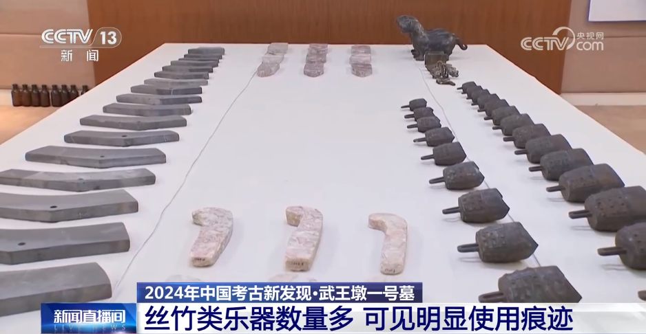 instrumen muzik peninggalan budaya juga merupakan badan utama makam No. 1 dari Wuwangdun. Mereka terutamanya dikebumikan di Bilik I, Bilik II dan Bilik II, termasuk dua set 23 keping tembaga, satu set 20 batu, tidak kurang daripada 50 set kayu lacquer dan sekurang-kurangnya 5 jenis gendang, dan tidak kurang daripada 10 set JIU. Instrumen ritual ini adalah instrumen praktikal, dengan komponen sebutan lengkap, dan jejak penggunaan yang jelas dapat dilihat dalam beberapa objek.