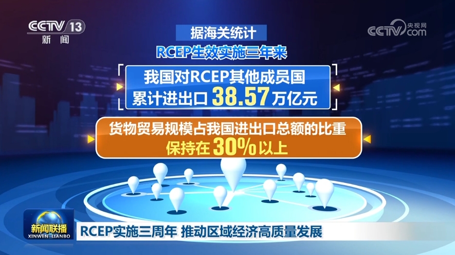 今年是《区域全面经济伙伴关系协定》(RCEP)生效实施三周年。作为世界上参与人口最多、经贸规模最大、最具发展潜力的自贸协定,生效三年来,贸易投资自由化便利化持续推进,形成区域合作、共享发展的新局面。