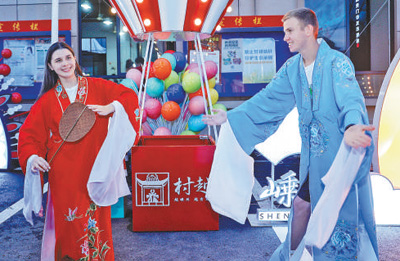 马克西姆(右)和叶卡捷琳娜在“村越”现场体验越剧服装。王泽农摄