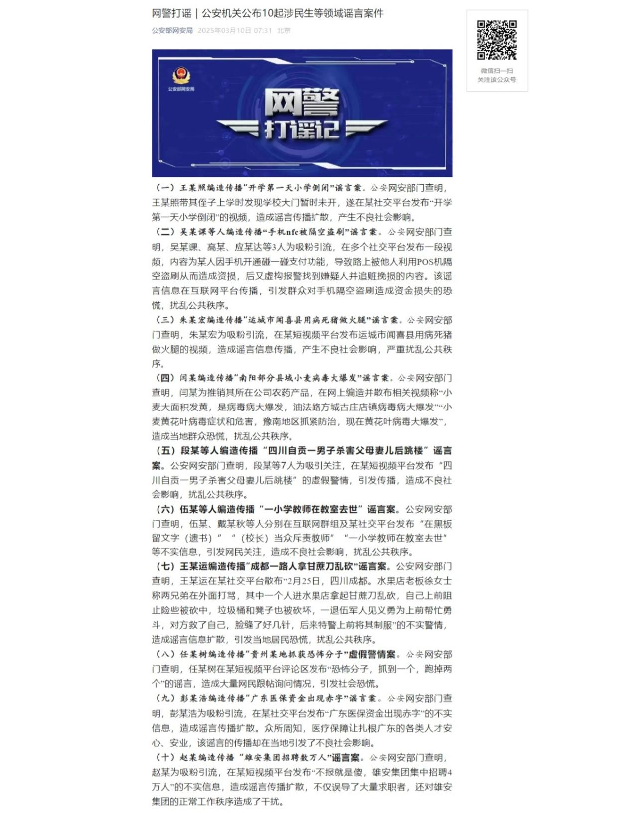 ·On March 10, the public security organs announced 10 rumor cases involving people's livelihood and other fields.