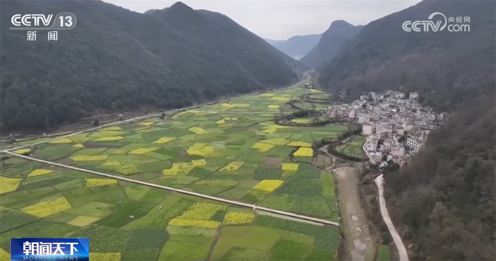 在惠水县摆金镇,2000亩油菜花也如期绽放,为大地铺上了一片金黄。油菜花与远处错落有致的农舍和山峦相互映衬,构成了一幅田园风光图。