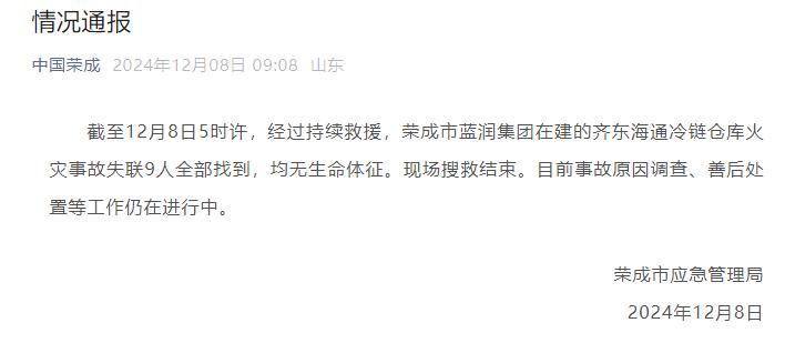 Noticias CCTV: Según la cuenta oficial de WeChat de Rongcheng, China, a las 5:00 del 8 de diciembre, después de un rescate continuo, las 9 personas desaparecidas en el accidente de incendio en el almacén de cadena de frío Qidong Haitong en construcción por Lanrun Group En la ciudad de Rongcheng no se encontraron signos vitales. La búsqueda y rescate en el lugar ha terminado. La investigación sobre la causa del accidente y sus consecuencias aún está en curso.