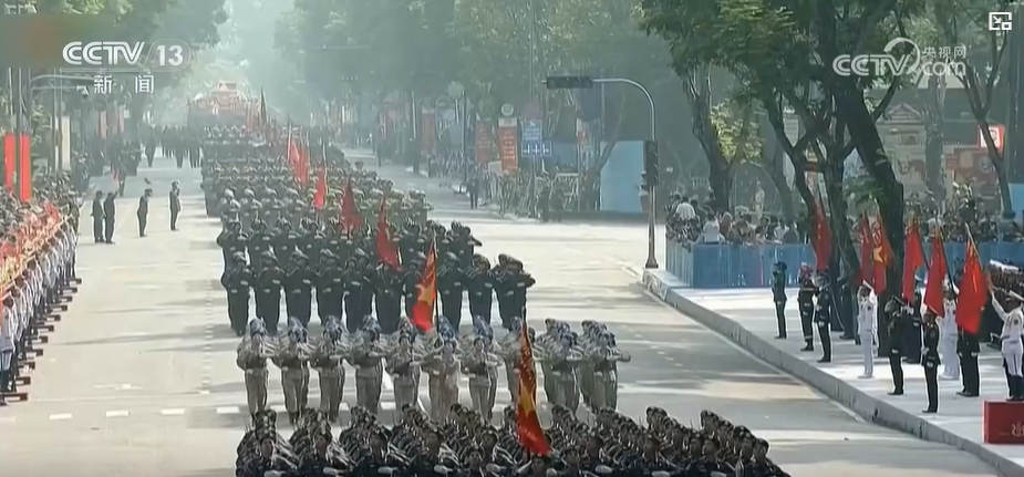กองทัพจากจีนลาวและกัมพูชาก็เข้าร่วมในขบวนพาเหรดทหาร ในที่เกิดเหตุเครื่องแบบและท่าทางทหารที่สูงขึ้นของกองทัพปลดปล่อยกองทัพประชาชนจีนได้รับการต้อนรับอย่างอบอุ่นจากชาวเวียดนาม การแสดงข้ามพรมแดนของผู้พิทักษ์เกียรติยศจีนแสดงให้เห็นอย่างเต็มที่และถ่ายทอดมิตรภาพที่ลึกซึ้งและความไว้วางใจซึ่งกันและกันระหว่างกองทัพจีนและเวียดนาม