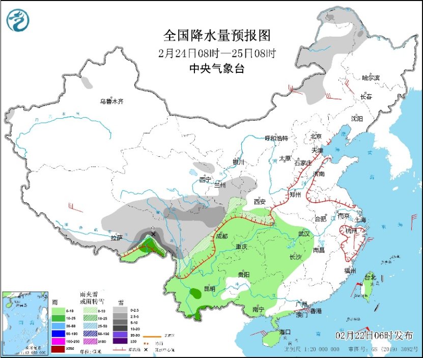 Bugün, Jiangnan bölgelerindeki yağışların devam etmesi bekleniyor. Doğu ve güney Tibet, Doğu Qinghai, Doğu Gansu, Doğu Sichuan Platosu ve diğer yerlerde ve yerel şiddetli karda hafif ila orta kar veya karla karışıktır.