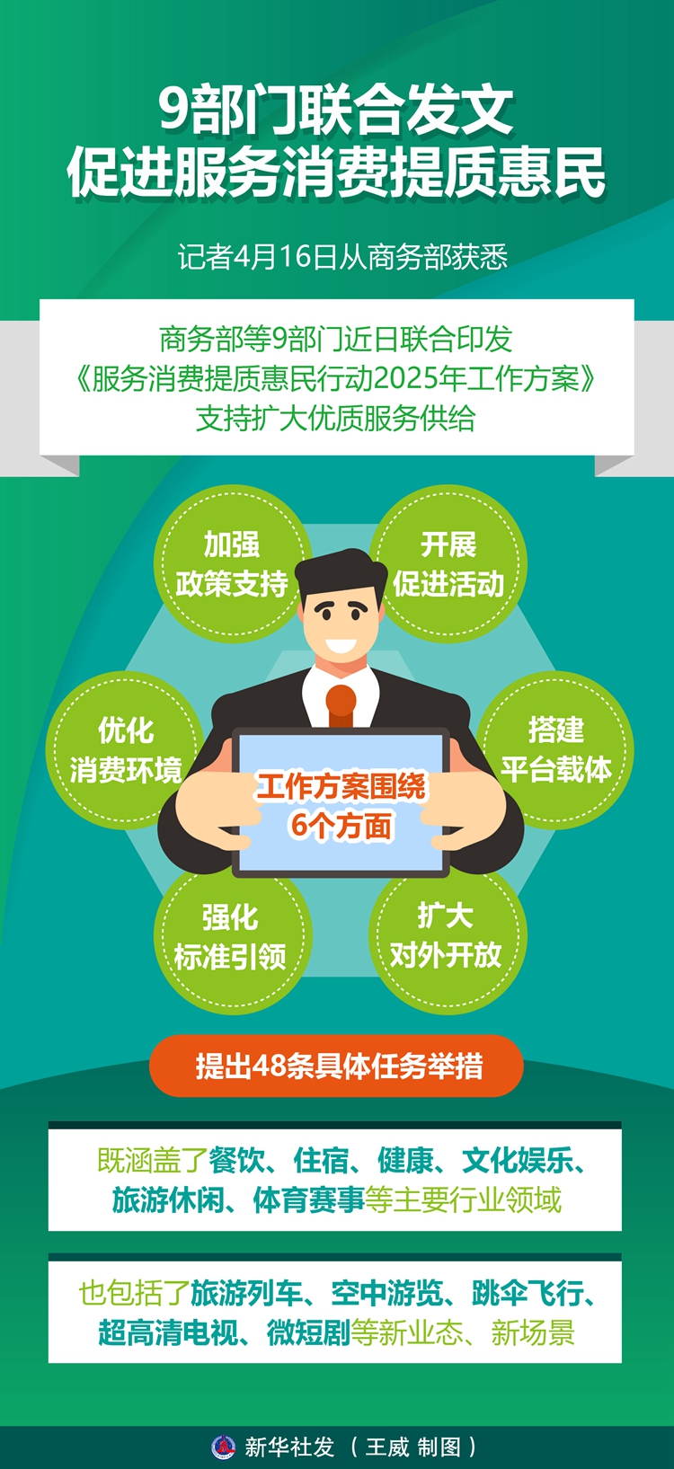 新華社北京4月16日電(記者謝希瑤、王雨蕭)記者16日從商務部獲悉,商務部等9部門近日聯合印發《服務消費提質惠民行動2025年工作方案》,支持擴大優質服務供給。
