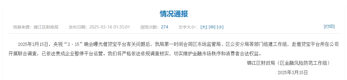 Daerah Jinjiang, Chengdu, Wilayah Sichuan mengarahkan Jiedaibao untuk menggantung operasi platform mengikut undang -undang