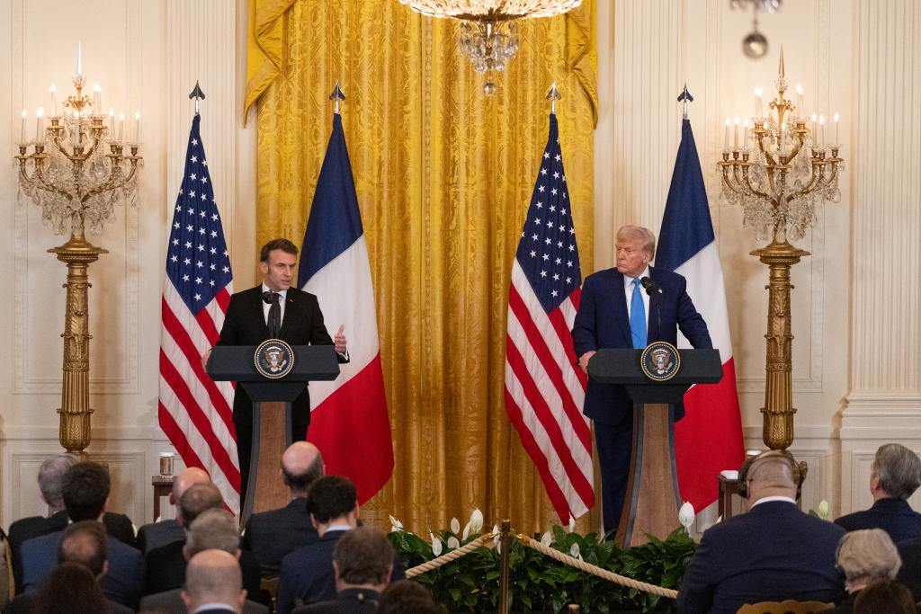 2月24日,美国总统特朗普(右)在华盛顿白宫与到访的法国总统马克龙举行会谈后的联合记者会。新华社记者 胡友松 摄