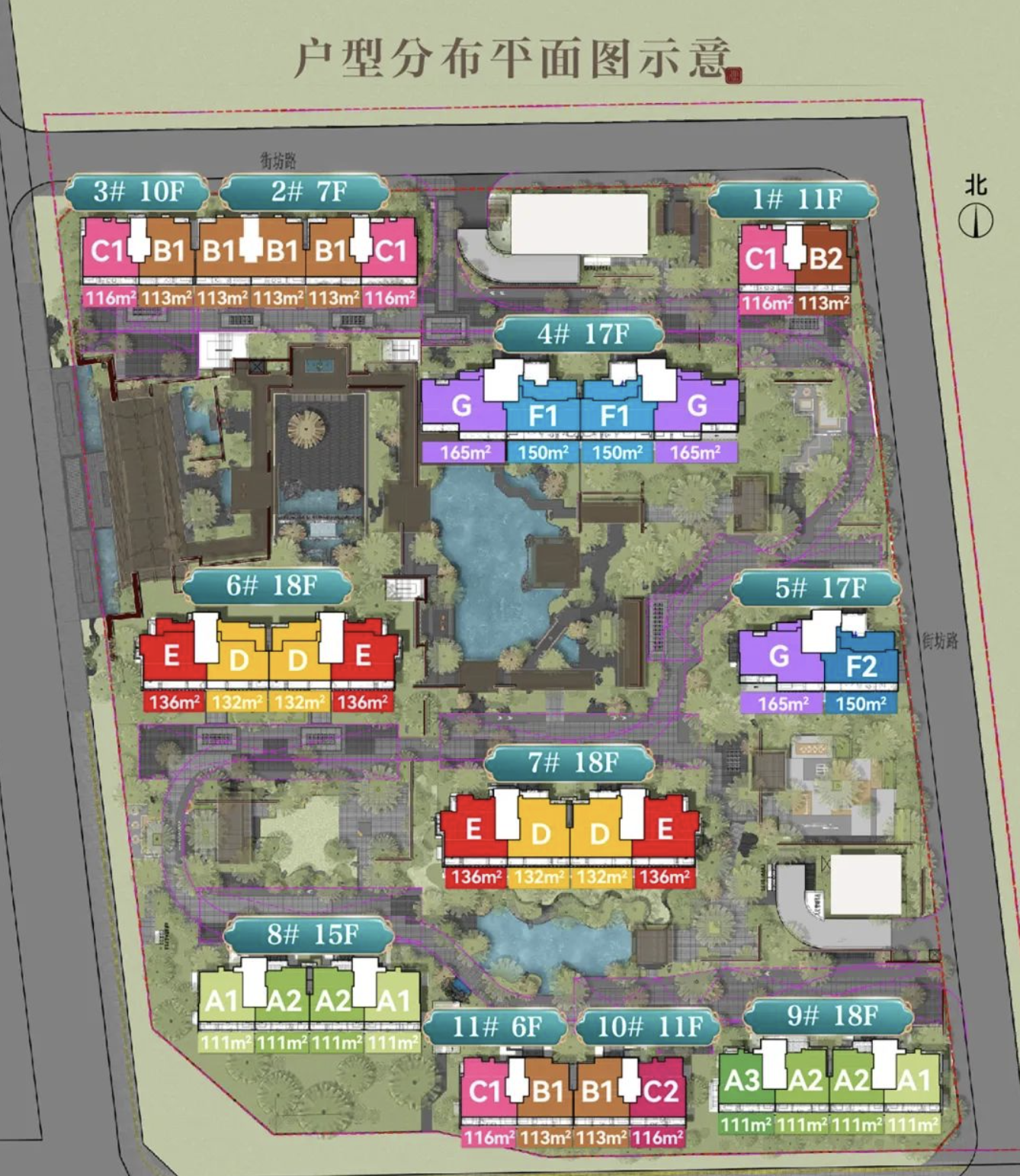 规划11栋6-18F洋房+小高层,总户数为479户。 共7个户型,面积段111-165㎡。