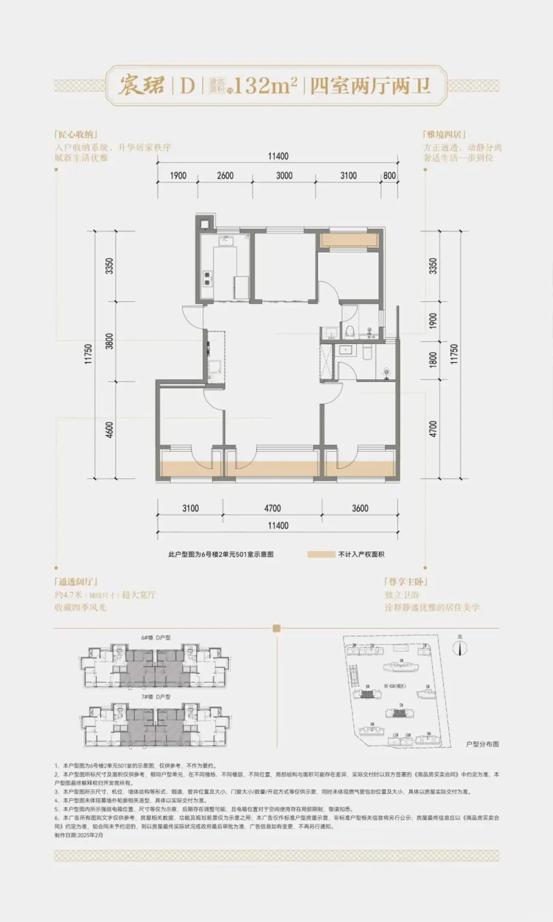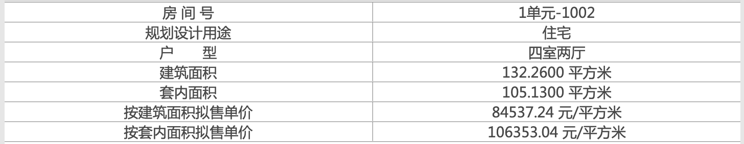 建面132.26㎡四室两厅(D户型),套内面积105.13㎡,得房率79.5%;