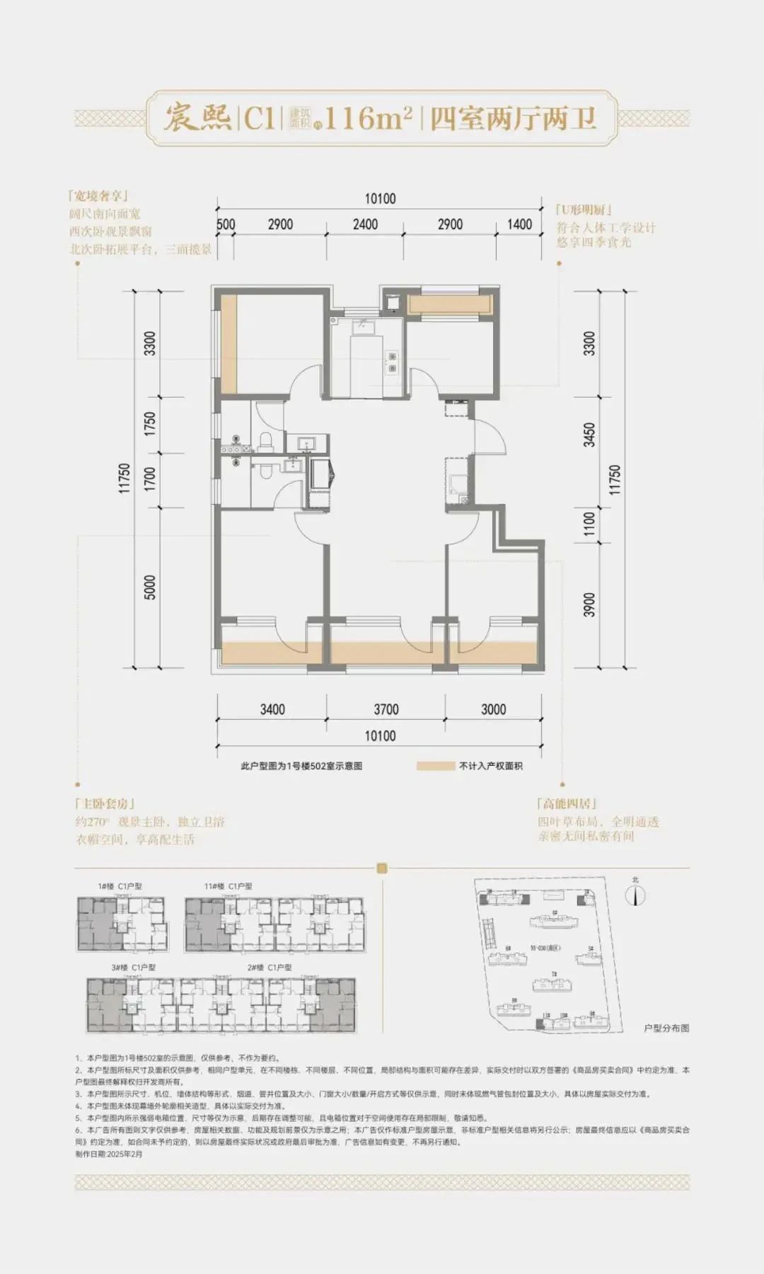 建面116.6㎡四室两厅(C户型),套内面积93.7㎡,得房率80.4%。