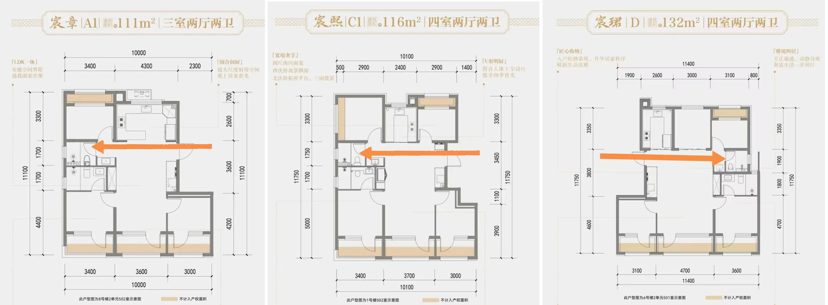 2、包括111、116和132在内的多个户型,入户门正对着卫生间。这种设计私密性不足,风水上也是大忌,“开门见厕,秽气迎头”。