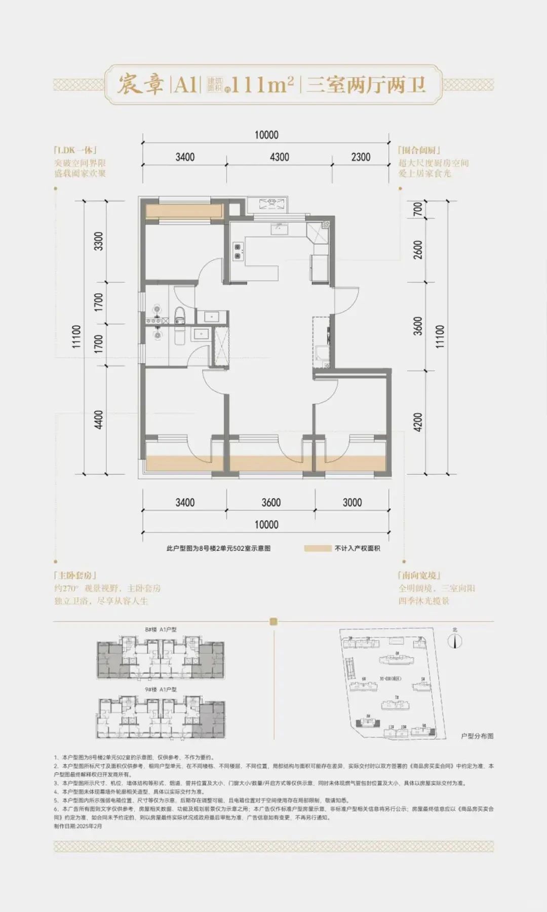 1、起步111户型三室双卫,南向三开间为通面宽阳台,主卧转角阳台,北向小卧搭配2.5㎡设备平台,空间不输于南向次卧;