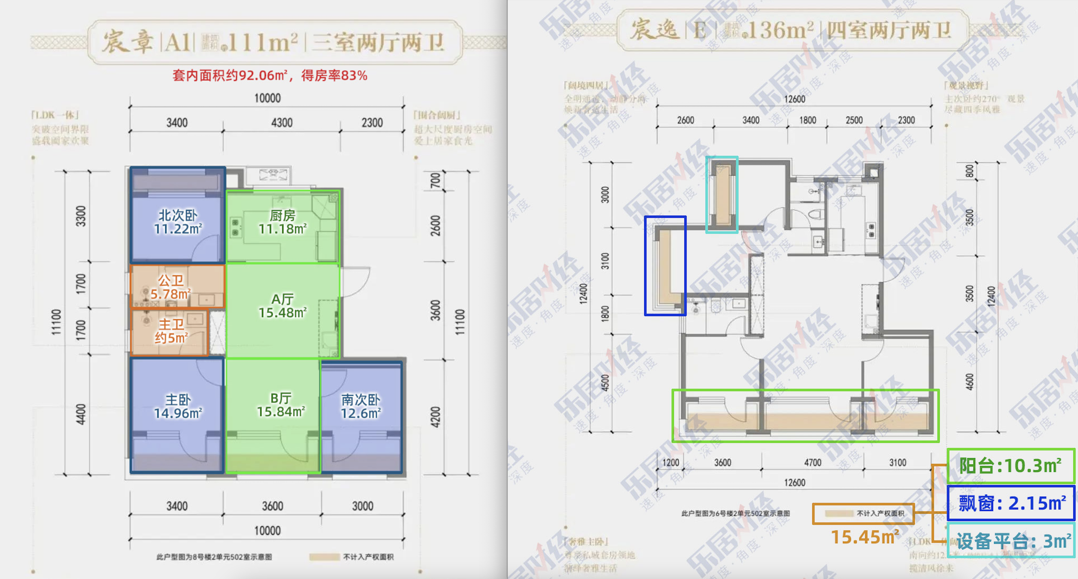 2、四居建面低至113平米,并且借助阳台和设备平台的扩展面积,打造出四叶草户型,并且每个卧室都能达到舒适面积,没有那种凑房间数的“小笼屋”。