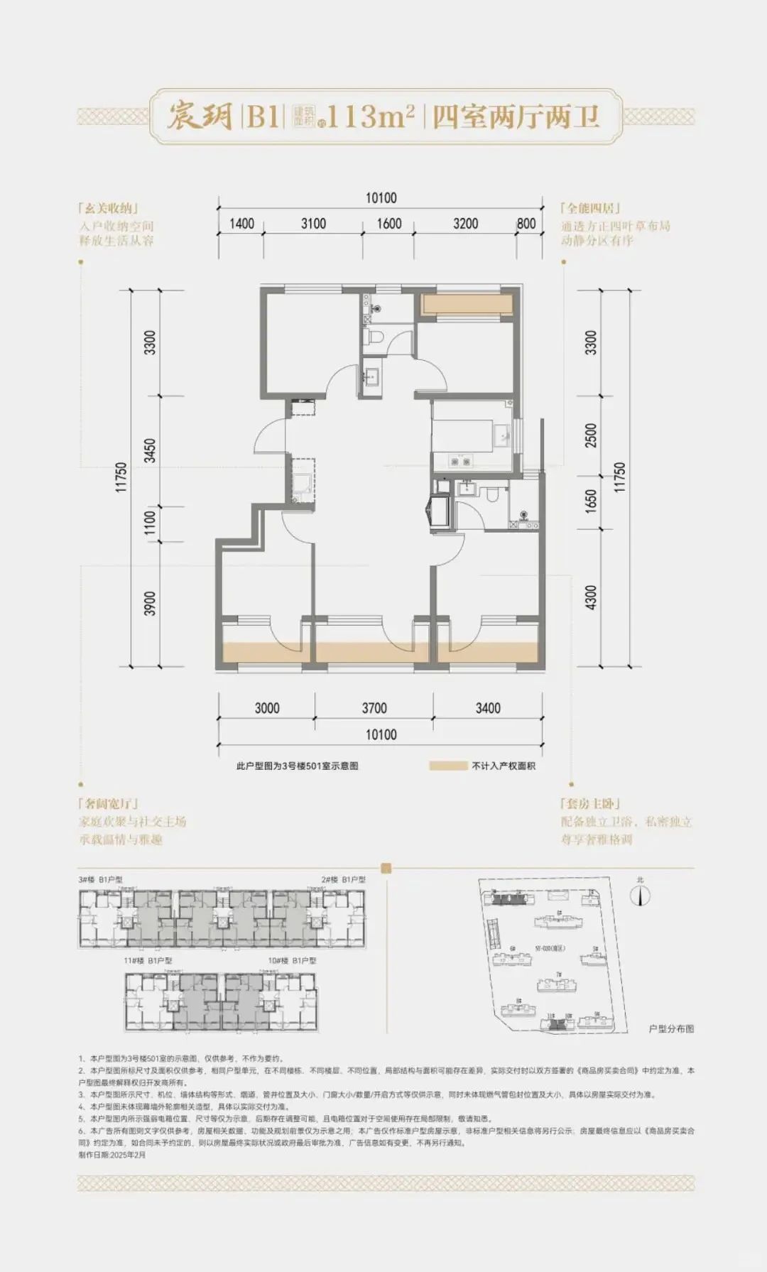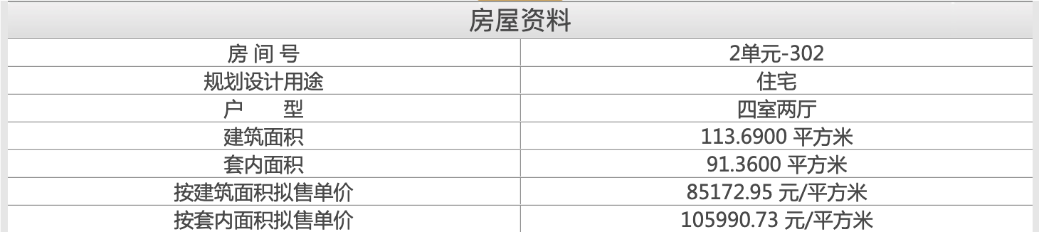 建面113.69㎡四室两厅(B户型),套内面积91.36㎡,得房率80.4%;
