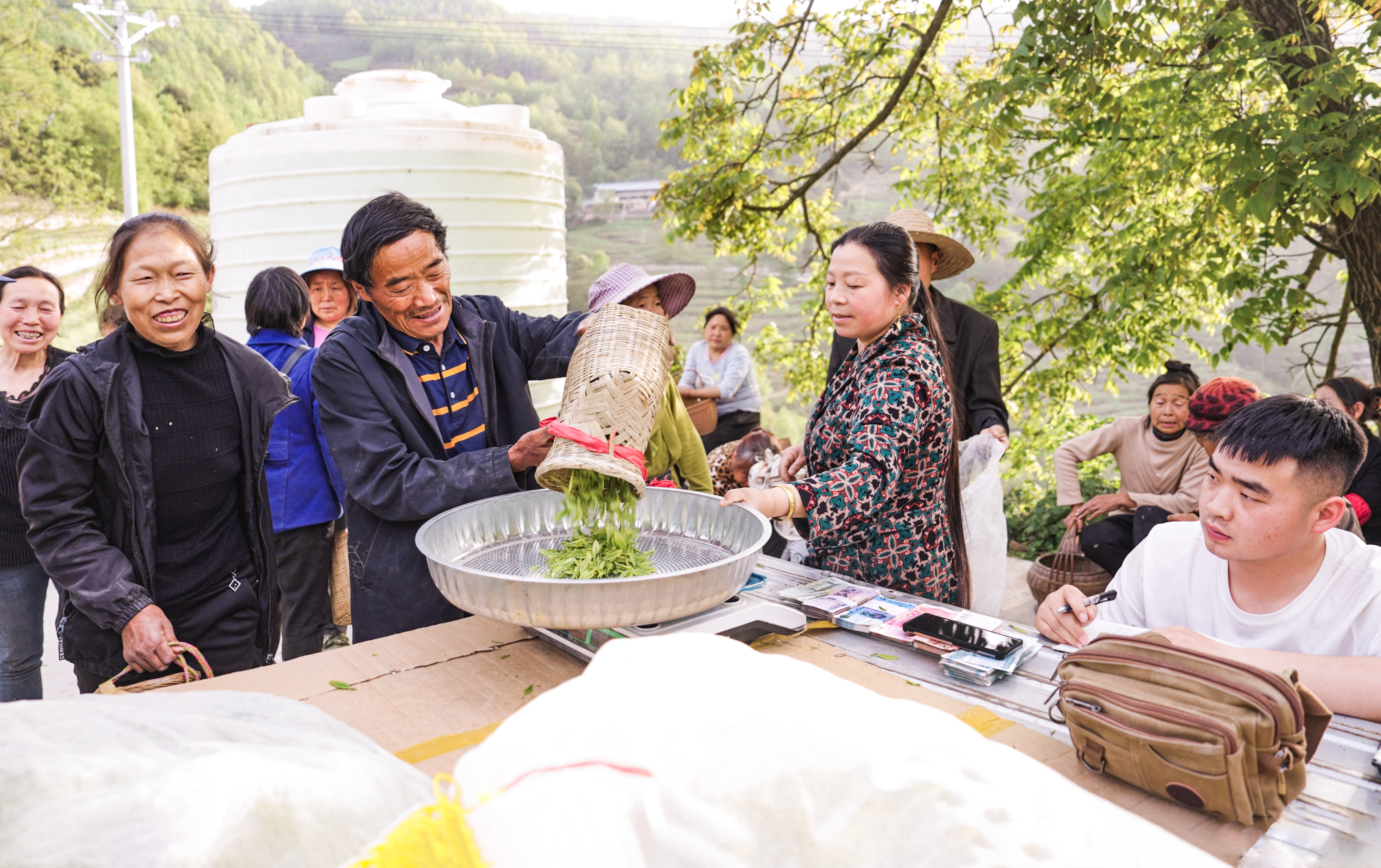 图为茶农正在售卖新摘下的茶芽。