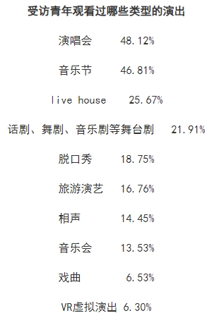 中青校媒调查发现,受访青年观看过各种类型的线下演出,排在前三位的分别是演唱会(48.12%)、音乐节(46.81%)、live house(25.67%),此外还有话剧、舞剧、音乐剧等舞台剧(21.91%)、脱口秀(18.75%)、旅游演艺(16.76%)、相声(14.45%)、音乐会(13.53%)、戏曲(6.53%)、VR虚拟演出(6.30%)等。