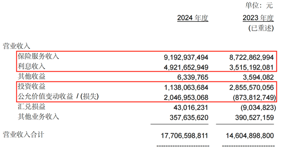 而在营业收入中反映投资所得的利息收入、投资收益和公允价值变动损益这三大指标,中意人寿表现比较分化。其中,主要来源于所持有的国债及政府债的利息收入达49.22亿元,比2023年的35.15亿元增长40.03%。而在受到交易性金融资产持有期间取得的投资收益减少,以及在处置交易性金融资产时出现的较大亏损的双重影响下,2024年中意人寿取得投资收益仅为11.38亿元,同比下降高达60.15%。公允价值变动收益则是另一番景象,去年其实现公允价值变动收益20.47亿元,相比于2023年亏损的8.74亿元可以说是惊天大逆转。