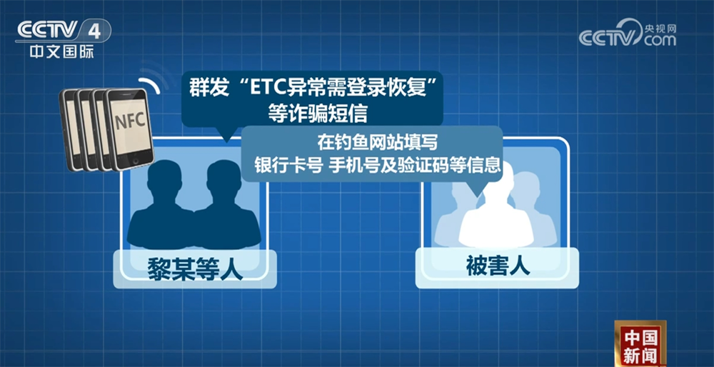 据介绍,这是一种将被害人的信用卡绑定在犯罪嫌疑人名下的电子钱包里,实施集中盗刷的犯罪形式。该犯罪团伙组织者黎某与刘某等人购买大量具有NFC功能的手机,并激活手机中的电子钱包。同时,为收集被害人银行卡信息,黎某等人通过群发“ETC异常需登录恢复”等诈骗短信,诱导多名被害人在钓鱼网站填写银行卡号、手机号及验证码等信息。