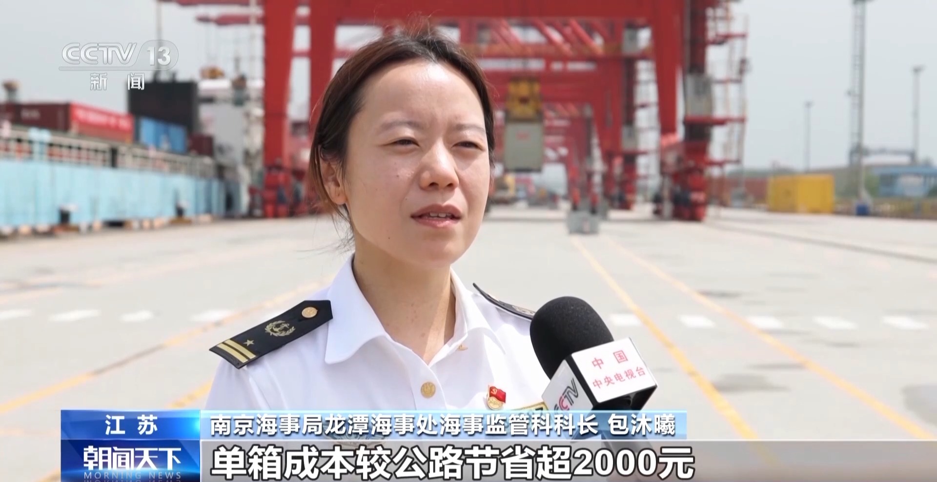 南京海事局龙潭海事处海事监管科科长 包沐曦:新政策实施后,如果选择水路运输,单箱成本较公路节省超2000元。可压缩整体物流时效2至3天,提升航运企业运营效率超30%左右。