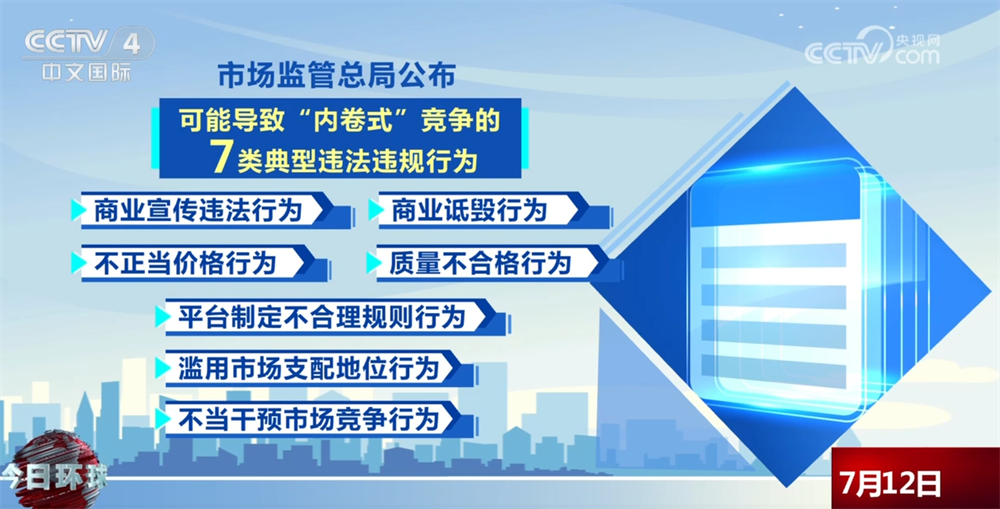 市场监管总局介绍“内卷式”竞争7类典型违法违规行为包括:商业宣传违法行为、商业诋毁行为、不正当价格行为、质量不合格行为、平台制定不合理规则行为、滥用市场支配地位行为、不当干预市场竞争行为。