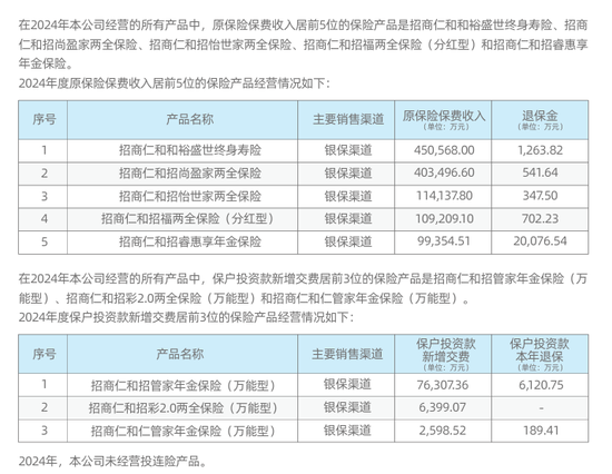 在利率下行的当下,各大保司纷纷转向分红险市场,而招商仁和人寿的传统险占比依旧很高。2024年年报显示,传统险收入合计131.45亿元,所有险种收入的86%。进一步看,该司三款传统型产品系绝对销售主力。2024年经营的所有产品中,原保险保费收入居前5位的保险产品是招商仁和和裕盛世终身寿险、招商仁和招尚盈家两全保险、招商仁和招怡世家两全保险,三款收入合计约97.26亿元。更值得注意的是,招商仁和和裕盛世终身寿险停售于2022年7月,却仍是去年主力产品之一。