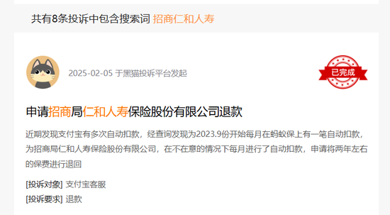 今年2月5日,黑猫投诉 【下载黑猫投诉客户端】有一条关于“申请招商局仁和人寿保险股份有限公司退款”的投诉。该投诉经平台审核后首次分配给招商仁和人寿,但因未匹配成功,转而由支付宝客服处理,目前状态显示为“已完成”。值得注意的是,2024年另有3条投诉因“商家未匹配成功”仍处于待分配状态。