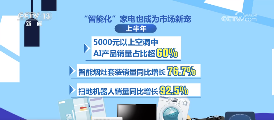 平台数据显示,今年上半年,县域家电市场加速提档升级,“大尺寸、大容量”家电成为深受消费者欢迎的品类。据统计,98英寸以上大屏电视销售同比增长43%,搭载净味除菌功能的550L以上大容量冰箱销售同比增长89%。“智能化”家电也成为市场新宠,上半年,5000元以上空调中,AI产品销量占比超60%,智能烟灶套装、扫地机器人销量同比分别增长76.7%、92.5%。