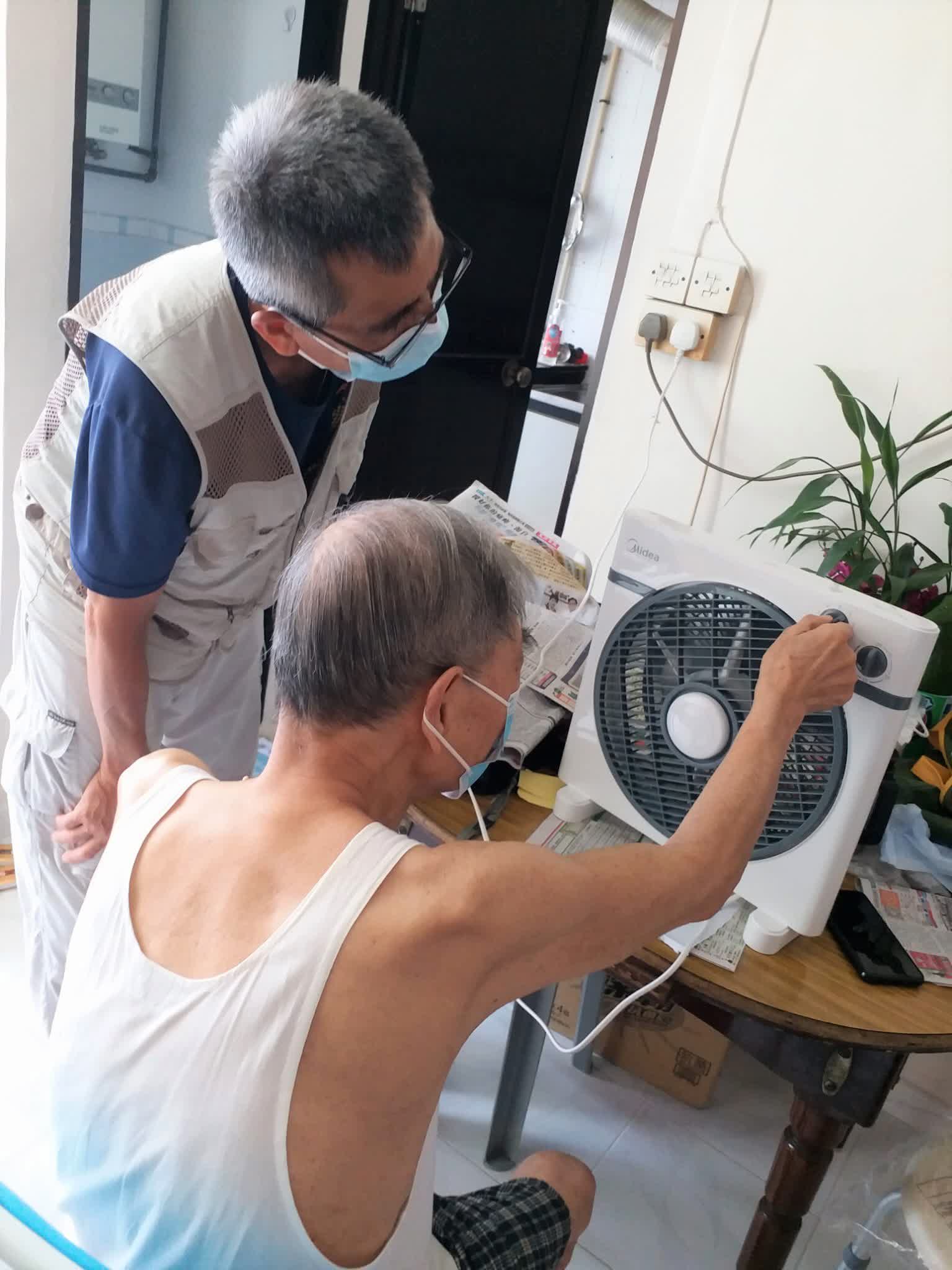 服務團隊今年曾接觸一名居於寮屋區的伯伯,因腳腫外出時需使用拐杖。炎熱天氣加上寮屋少窗且翳焗,家中風扇已壞掉,他想到戶外乘涼,惟行動能力有限,有時會因腳痛要留在家中。可是天氣太熱,他有時在家會感到頭暈或疲倦。經社工轉介,他於今年七月底透過上述計劃獲贈一部座地風扇。伯伯形容,新風扇風力強,且送風範圍廣,大大改善悶熱難耐的家居環境。