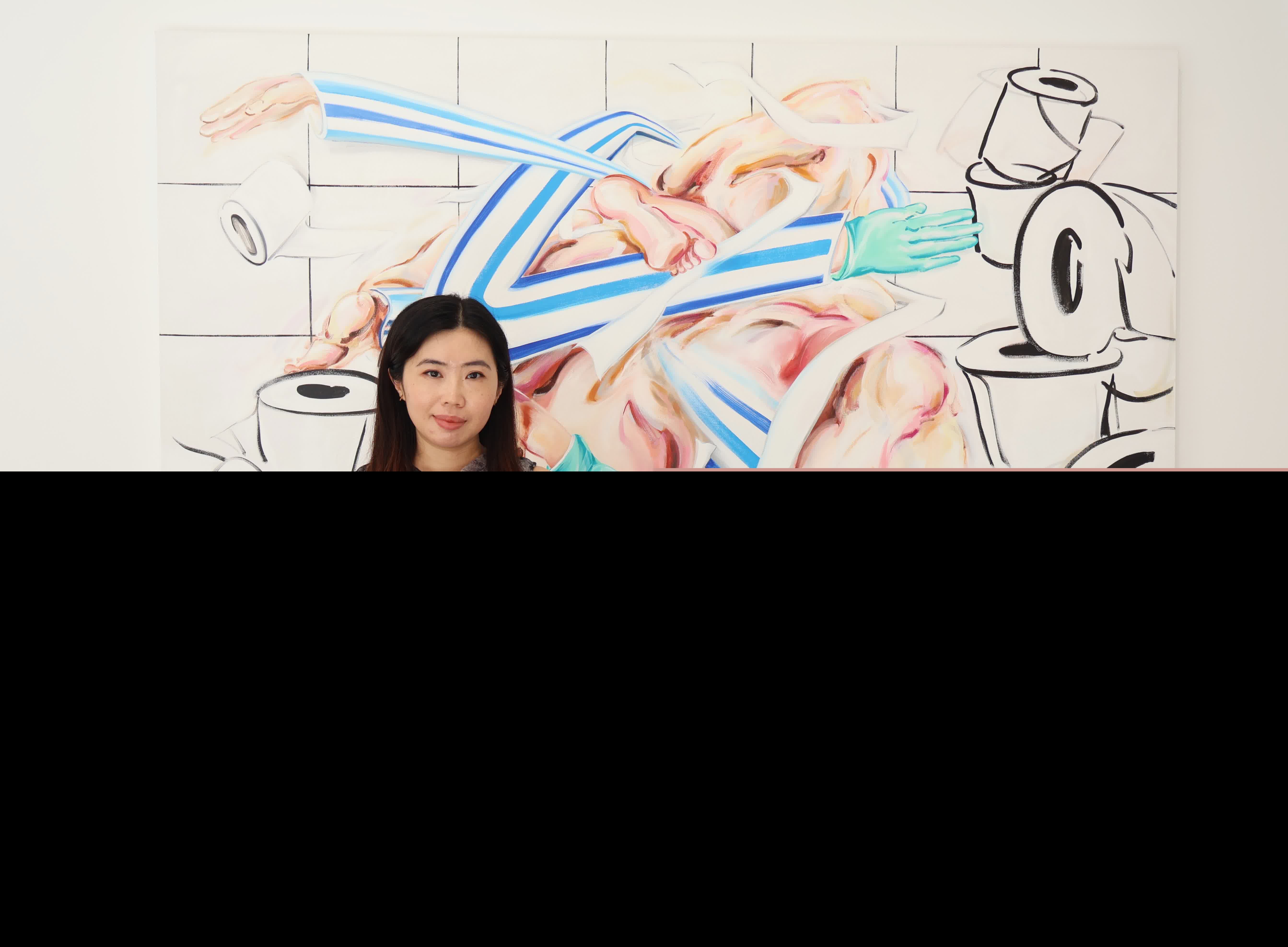 「挪動的手」是此次展出作品中的重要元素,配合橡膠手套及衛生間般的畫面基底,Yvonne希望營造一種清潔、塗抹、打破界限的場景。「有些是赤手,有些手則戴着手套。很多衣服也都是條紋的,像是制服,以體現一種制度化的身體。也會有人聯想到睡衣和病號服。」Yvonne表示,這讓作品有了多重含義。