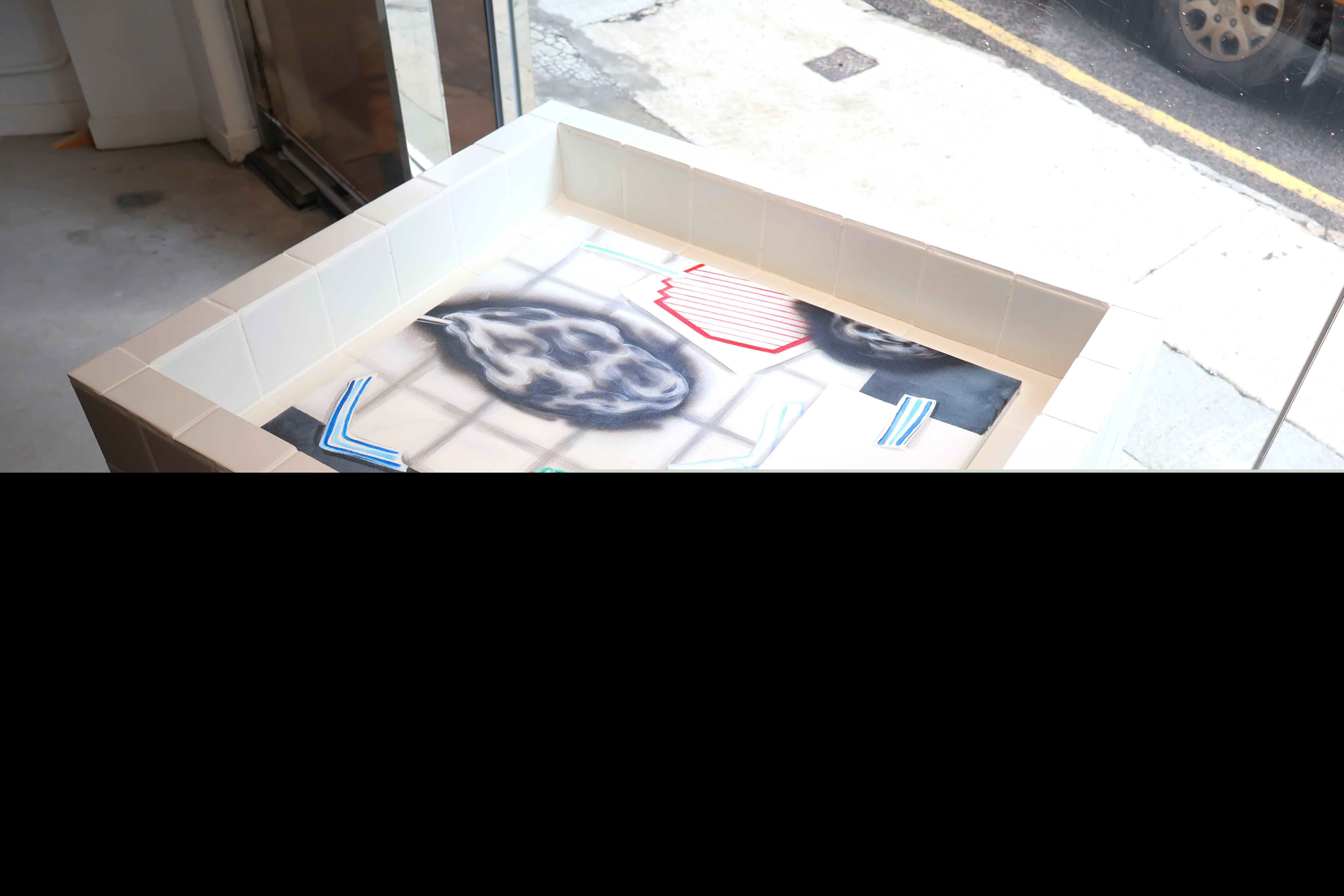 網格是多幅作品中的主要背景,Yvonne借它們規劃構圖。她分享,自己會畫出很多相似的網格,隨後以不同方式畫出各種形態的身體,而網格也扮演着「協助梳理信息的工具」的角色。此外,Yvonne表示,城市規劃的過程也會採用許多網格,香港地鐵站這類公共空間內亦有很多瓷磚格子,「這種設計優先考慮了功能性和效率」。由此,Yvonne將瓷磚格從畫中延伸到展場,請人專門打造了一塊瓷磚展枱。