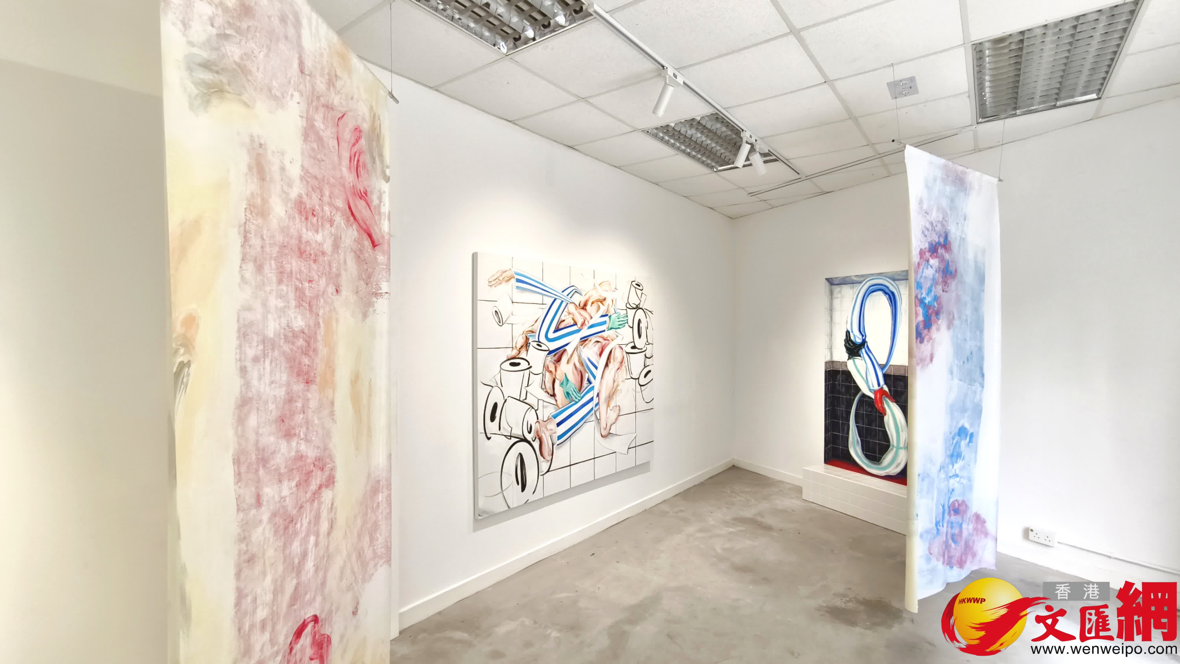 場域特定的懸掛乳膠畫,也為展覽空間及Yvonne具有含蓄想法的畫作,增添了私密性。