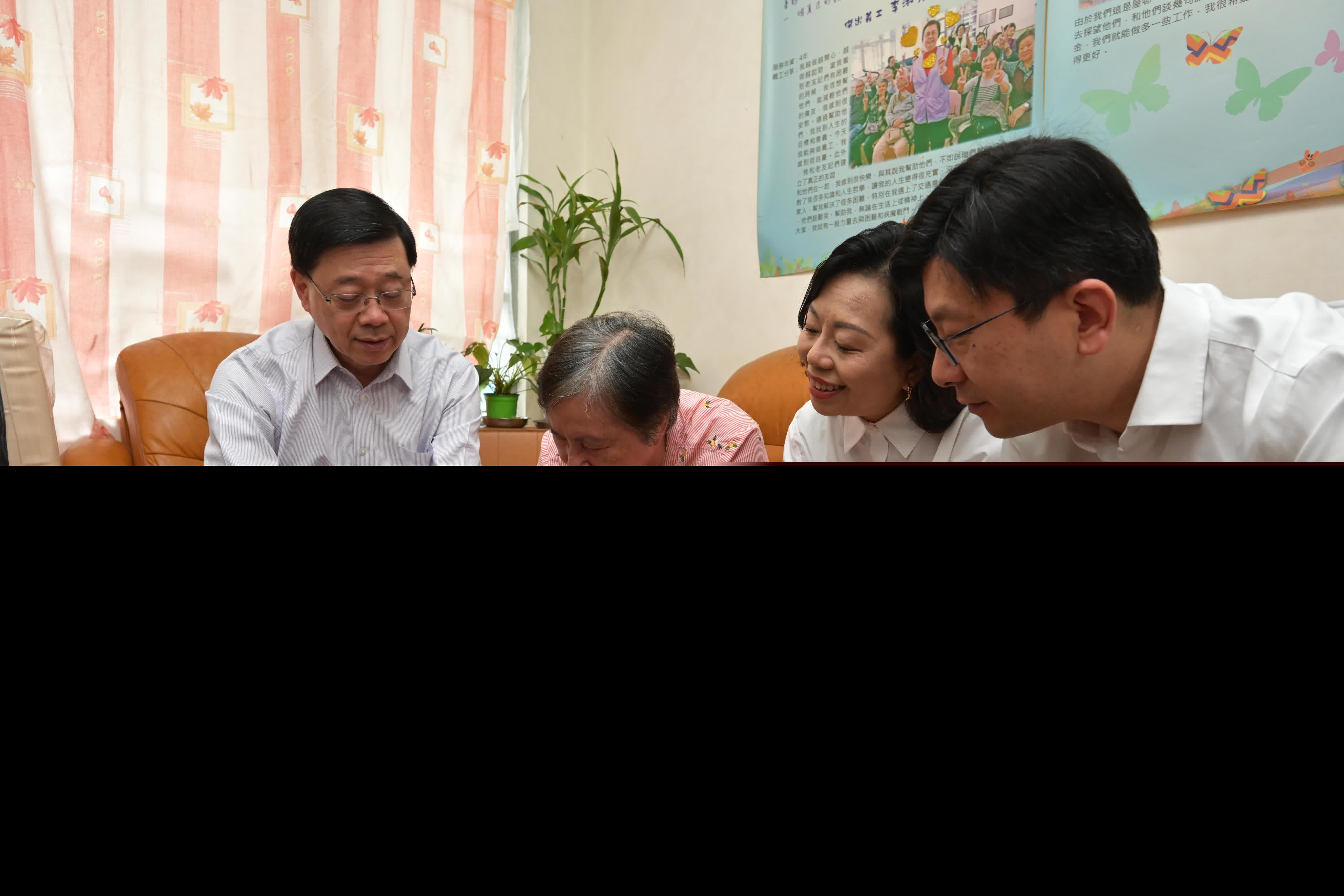 李家超(左一)在民政及青年事務局局長麥美娟(右二)和勞工及福利局局長孫玉菡(右一)陪同下探訪一名居住在愛東邨的獨居長者。