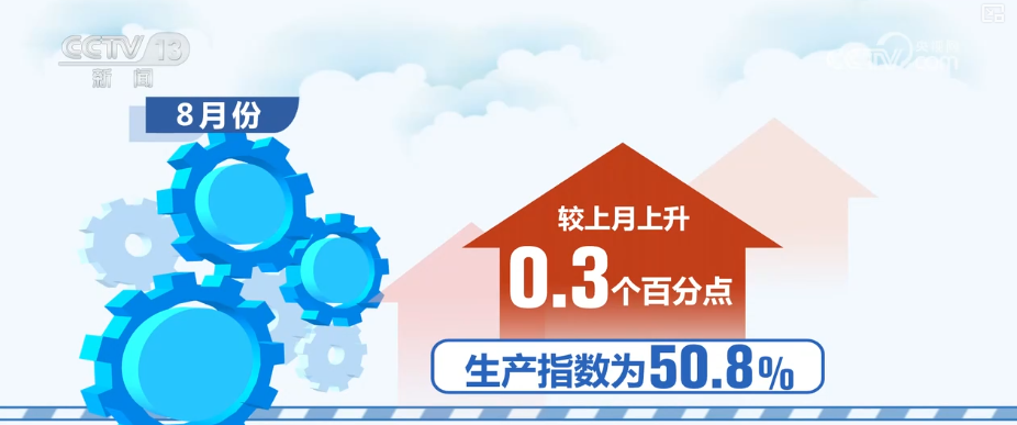 8月份,中国制造业采购经理指数为49.4%,较上月上升0.1个百分点。制造业市场需求有所改善,环比小幅回升。在需求趋稳以及极端天气影响减弱等因素的带动下,企业生产意愿有所释放,生产活动稳定扩张。8月份,生产指数为50.8%,较上月上升0.3个百分点。