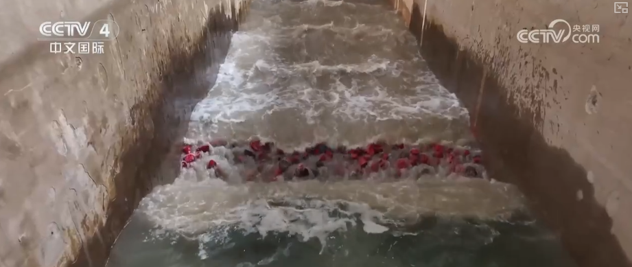 这是世界上综合性能领先的大比尺波浪水槽,可以模拟百年一遇的风浪场景。在水槽中正在开展的是阿联酋某港口防波堤抗浪实验,实验人员按照1:5的比例,把实际的防波堤缩小建造出来,用于研究不同海况和水位组合下的防波堤的稳定性。