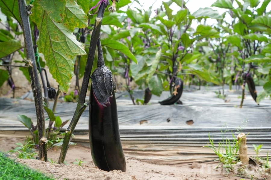 图为噶尔县生态农业产业园区的温室大棚内种植的茄子 摄影:边子捷