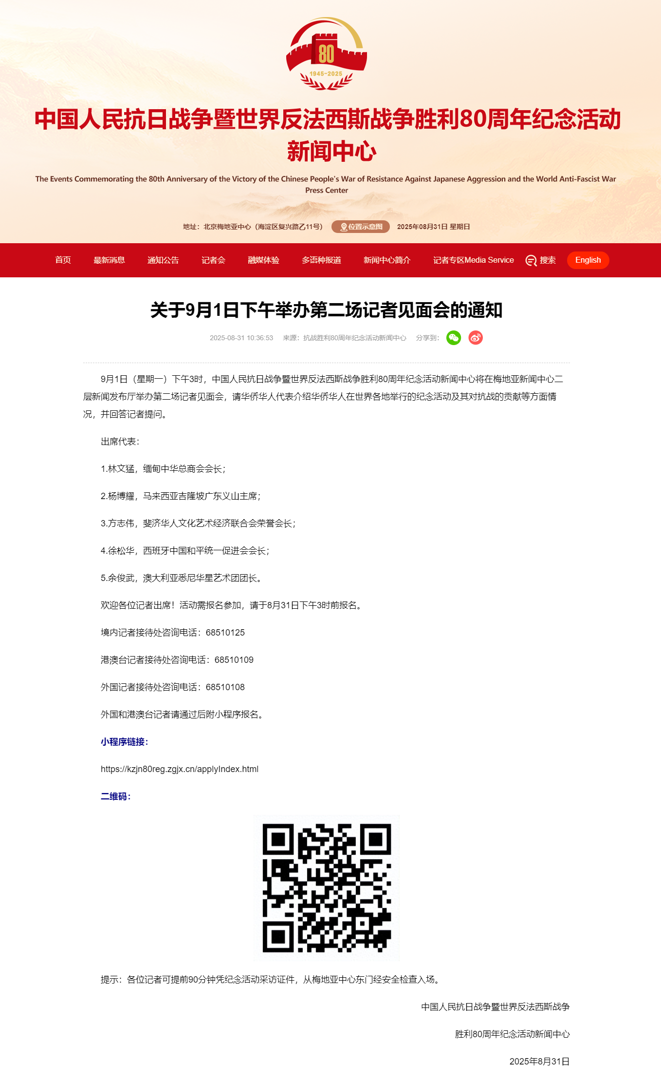 央视网消息:9月1日(星期一)下午3时,中国人民抗日战争暨世界反法西斯战争胜利80周年纪念活动新闻中心将在梅地亚新闻中心二层新闻发布厅举办第二场记者见面会,请华侨华人代表介绍华侨华人在世界各地举行的纪念活动及其对抗战的贡献等方面情况,并回答记者提问。