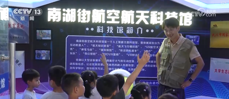 一大早,湖北武汉南湖街道中央花园社区里的航空航天科技馆就迎来了一批小参观者。孩子们对这些航空航天展品和设备都很感兴趣。