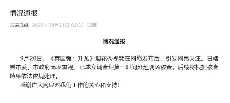 9月19日,一场名为《升龙》的烟花表演在西藏喜马拉雅山脉海拔约5500米的查琼岗日山脊上演。金色烟花沿山脊蜿蜒成“龙”,持续绽放约五分钟。然而,这场“视觉盛宴”并未赢得掌声,反而引发舆论广泛质疑。