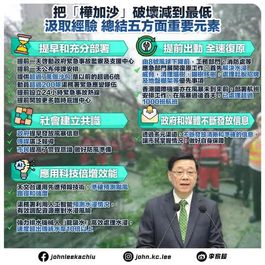 李家超表示,已要求應對極端天氣督導委員會全面總結今次經驗,將成功做法系統化、制度化,持續提升政府及社會應對能力,同時研究優化經常受風暴威脅地區的基礎工程、設施及裝備,以應對未來極端天氣威脅,更好保障香港。