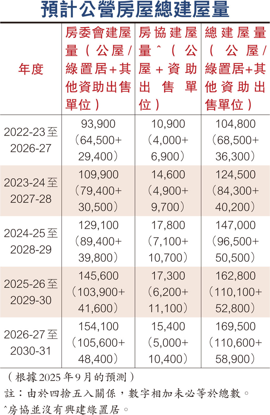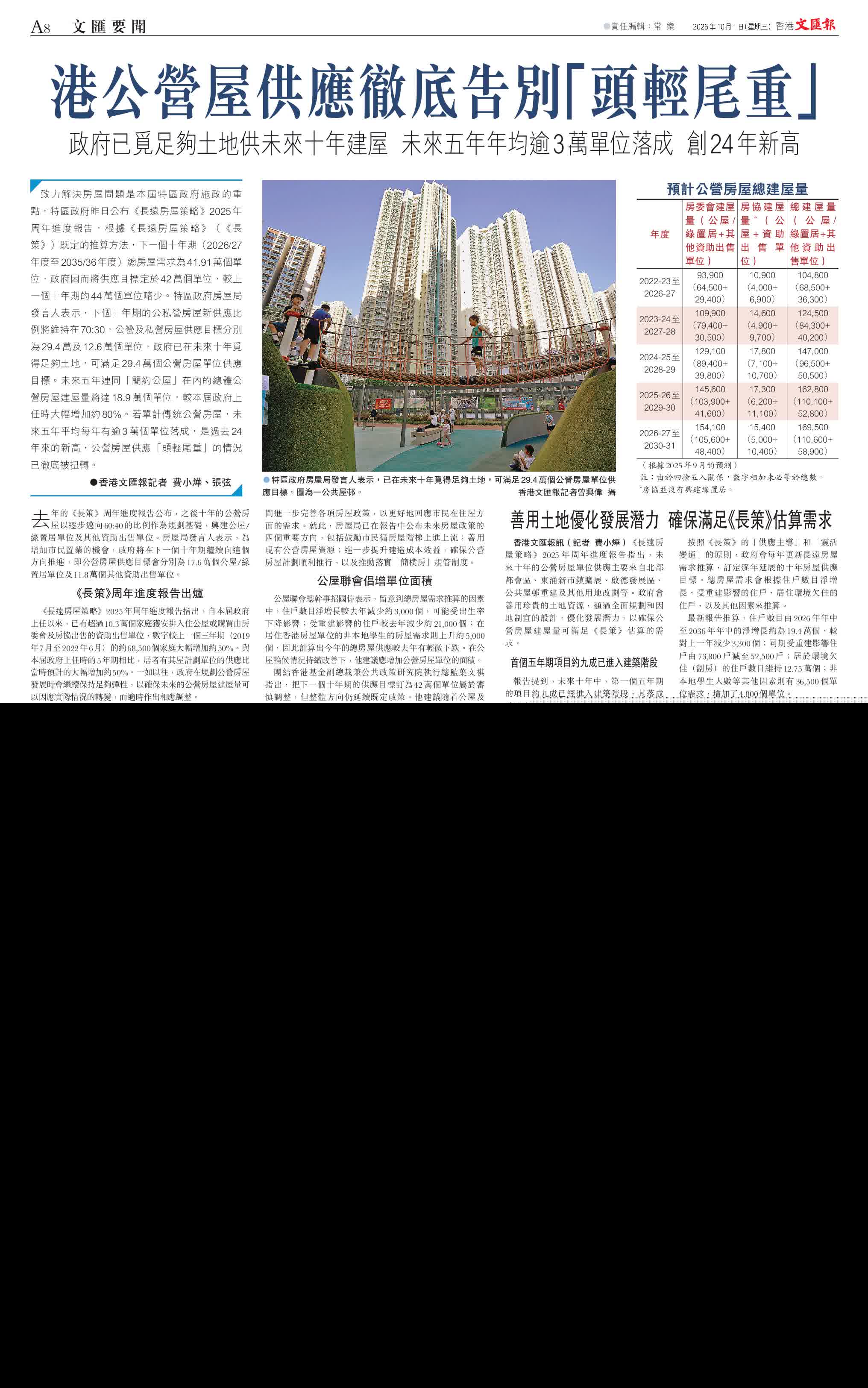 (記者 費小燁)《長遠房屋策略》2025年周年進度報告指出,未來十年的公營房屋單位供應主要來自北部都會區、東涌新市鎮擴展、啟德發展區、公共屋邨重建及其他用地改劃等。政府會善用珍貴的土地資源,通過全面規劃和因地制宜的設計,優化發展潛力,以確保公營房屋建屋量可滿足《長策》估算的需求。