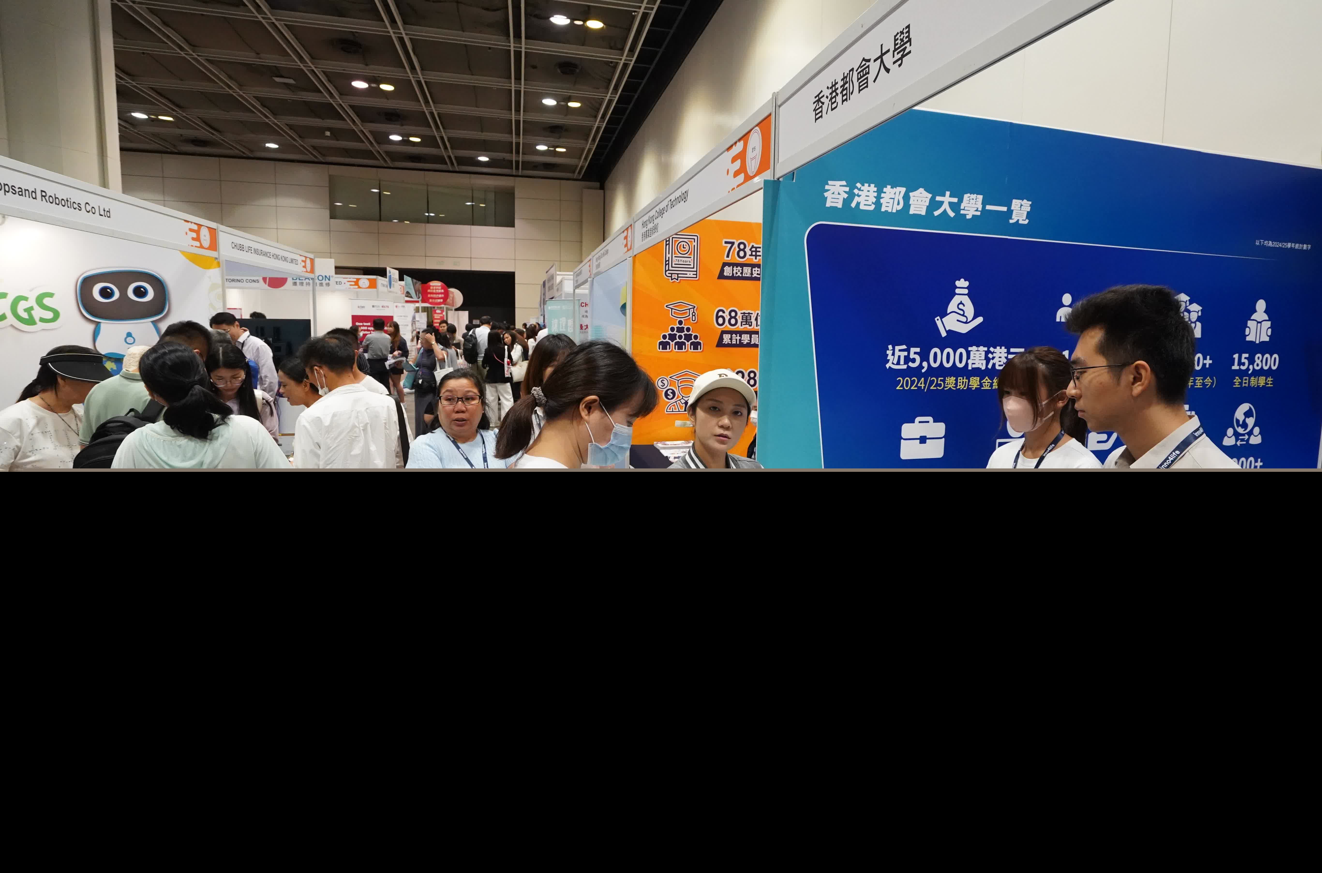 「inno4life創意文化及科技創新展覽2025」及「大灣區升學教育及人才交流博覽會2025」今日在香港灣仔會議展覽中心開幕。(香港文匯報記者 曾興偉 攝) 博覽會響應「留學香港」政策,匯聚逾百所學校資源,提供百場講座,活動首日吸引近1,000人觀展,近300個企業及院校參與。