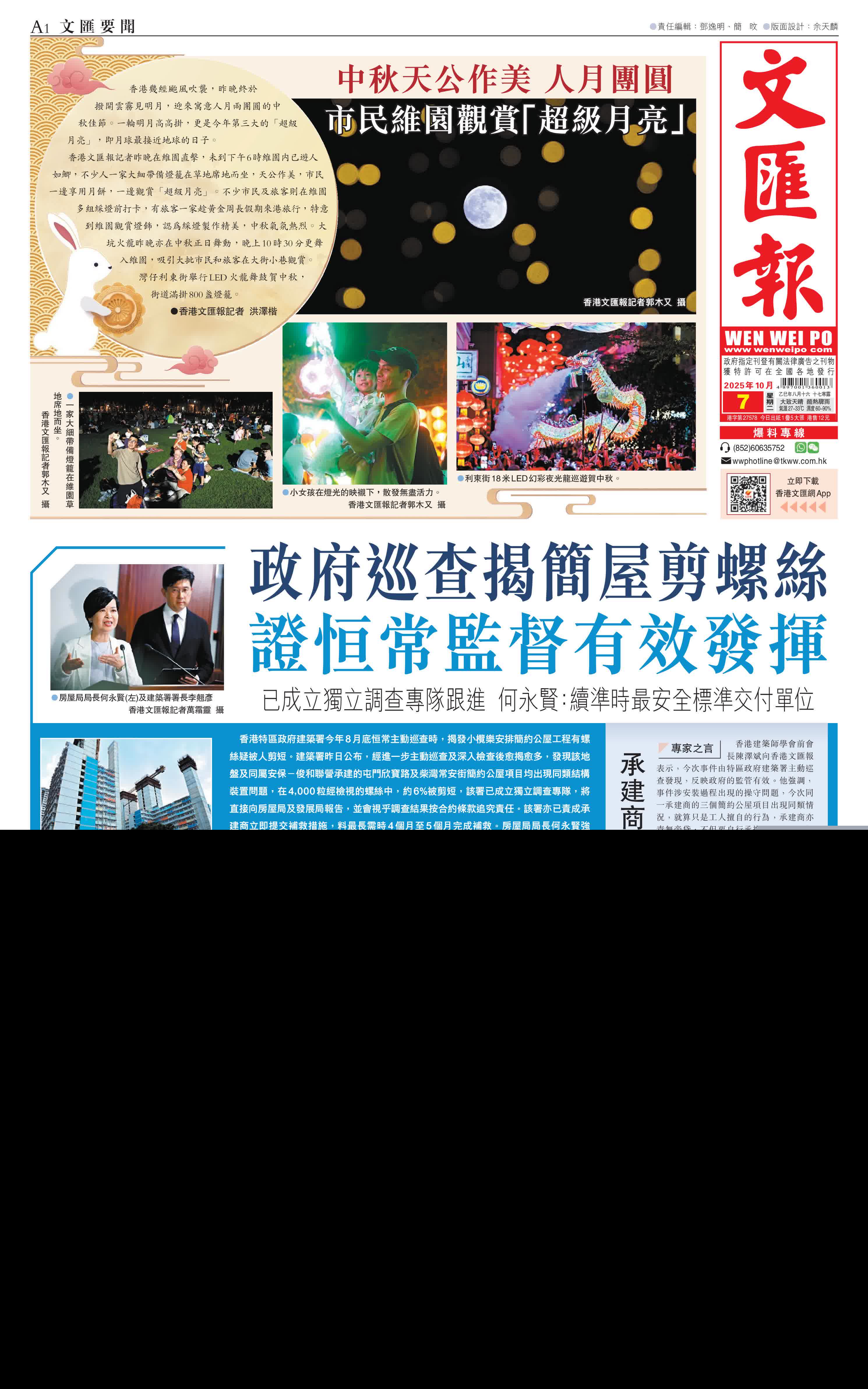 (香港文匯報記者 嚴鍇華、李芷珊)香港特區政府建築署今年8月底恒常主動巡查時,揭發小欖樂安排簡約公屋工程有螺絲疑被人剪短。建築署昨日公布,經進一步主動巡查及深入檢查後愈揭愈多,發現該地盤及同屬安保-俊和聯營承建的屯門欣寶路及柴灣常安街簡約公屋項目均出現同類結構裝置問題,在4,000粒經檢視的螺絲中,約6%被剪短,該署已成立獨立調查專隊,將直接向房屋局及發展局報告,並會視乎調查結果按合約條款追究責任。該署亦已責成承建商立即提交補救措施,料最長需時4個月至5個月完成補救。房屋局局長何永賢強調,香港建築結構的安全系數高,經歷幾次颱風仍然穩固,今次僅為個別事件,同時反映政府的監測制度有效發揮監督作用,簡約公屋工程將在原定時間內,以最高質素及最安全的標準交到住戶手中。