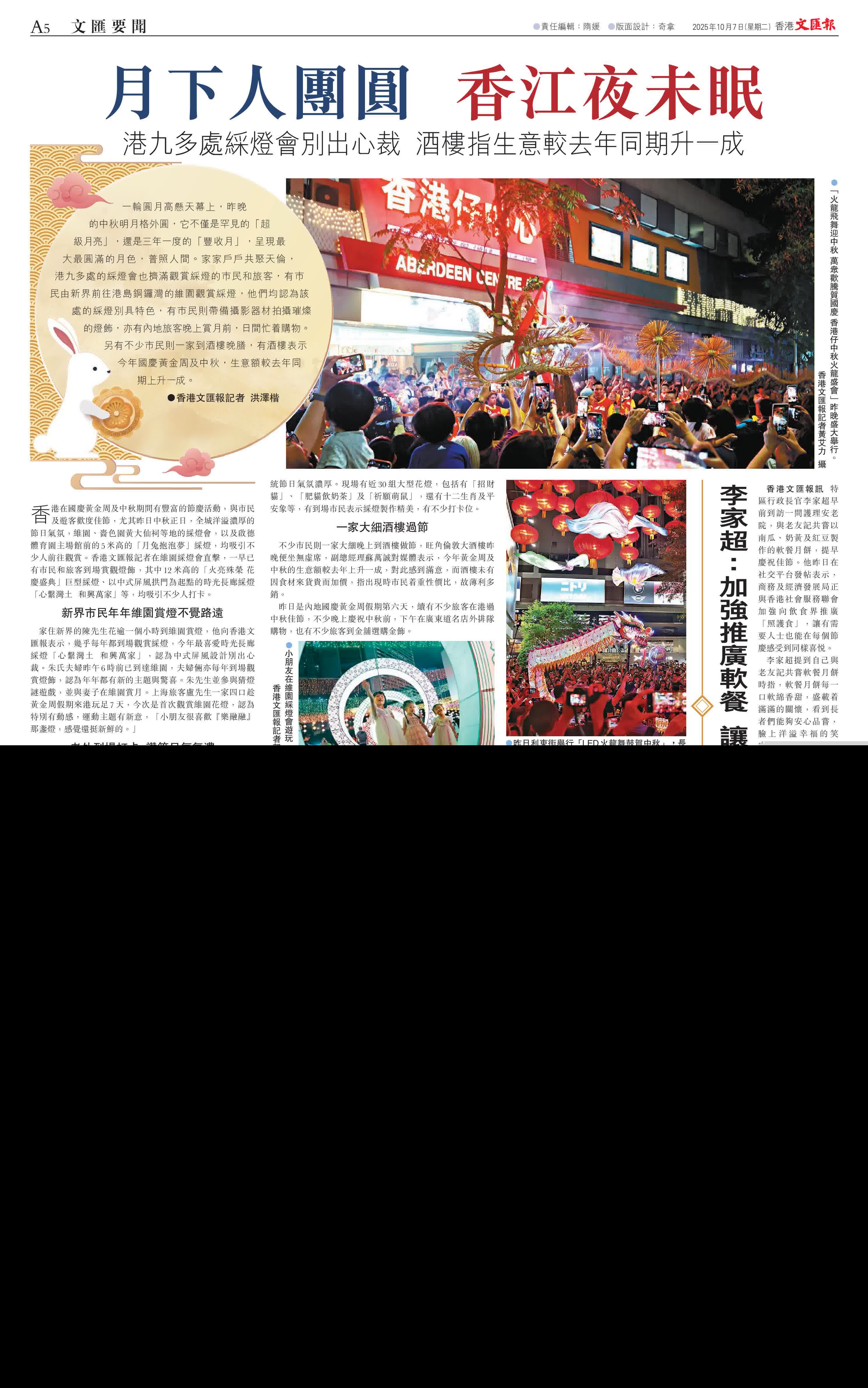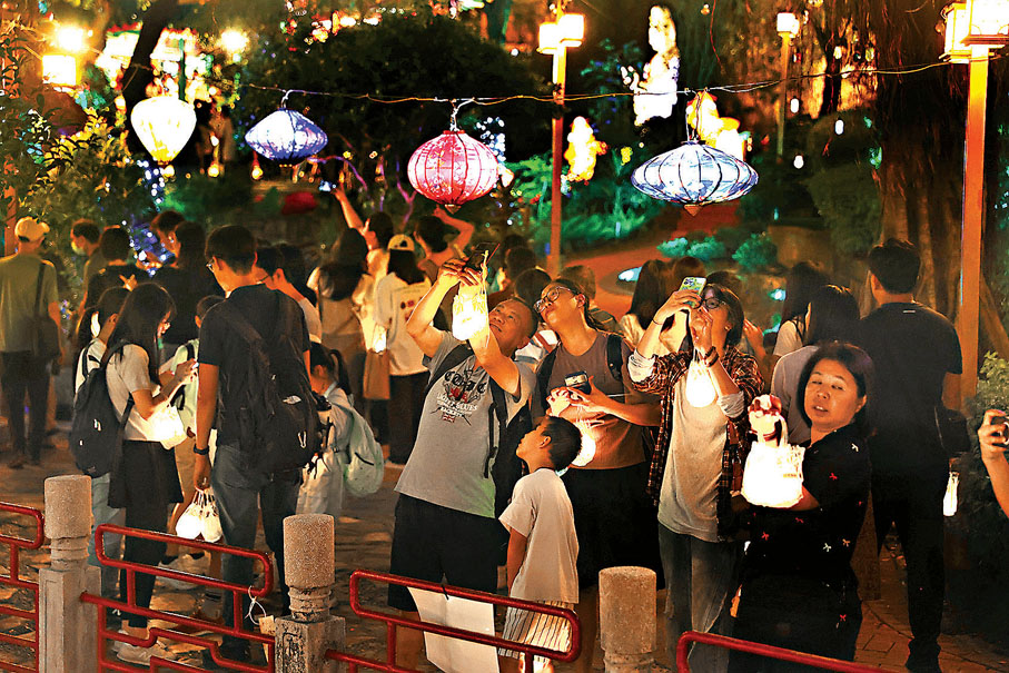 香港在國慶黃金周及中秋期間有豐富的節慶活動,與市民及遊客歡度佳節,尤其昨日中秋正日,全城洋溢濃厚的節日氣氛,維園、嗇色園黃大仙祠等地的綵燈會,以及啟德體育園主場館前的5米高的「月兔抱泡夢」綵燈,均吸引不少人前往觀賞。香港文匯報記者在維園綵燈會直擊,一早已有巿民和旅客到場賞觀燈飾,其中12米高的「火亮殊榮 花慶盛典」巨型綵燈、以中式屏風拱門為起點的時光長廊綵燈「心繫灣土 和興萬家」等,均吸引不少人打卡。