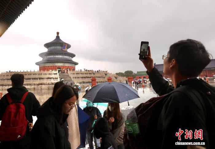 10月8日,今年国庆中秋假期最后一天,游客在天坛公园游览拍照。中新社记者 易海菲 摄