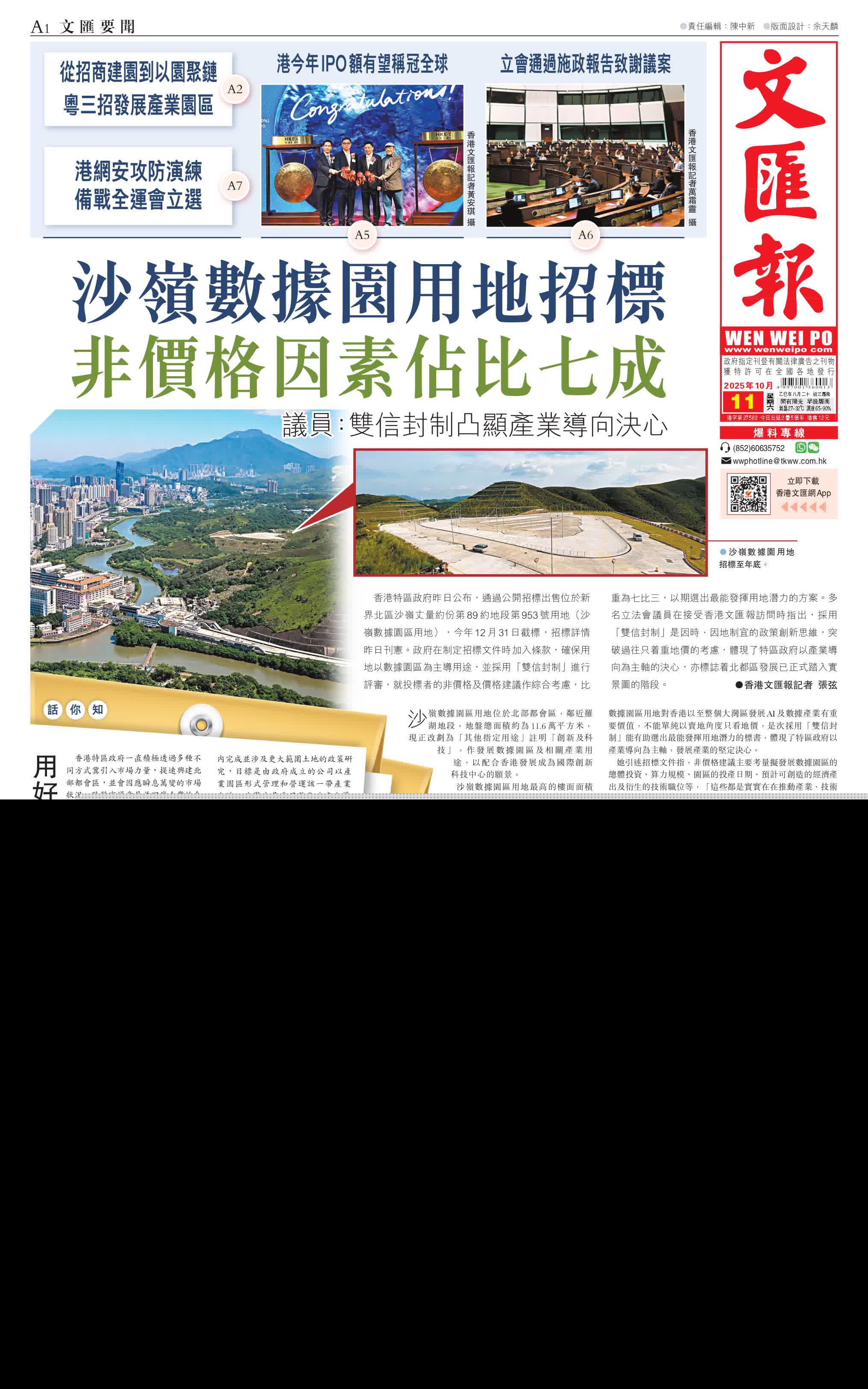 香港文匯報訊(記者 張弦)香港特區政府昨日公布,通過公開招標出售位於新界北區沙嶺丈量約份第89約地段第953號用地(沙嶺數據園區用地),今年12月31日截標,招標詳情昨日刊憲。政府在制定招標文件時加入條款,確保用地以數據園區為主導用途,並採用「雙信封制」進行評審,就投標者的非價格及價格建議作綜合考慮,比重為七比三,以期選出最能發揮用地潛力的方案。多名立法會議員在接受香港文匯報訪問時指出,採用「雙信封制」是因時、因地制宜的政策創新思維,突破過往只着重地價的考慮,體現了特區政府以產業導向為主軸的決心,亦標誌着北都區發展已正式踏入實景圖的階段。