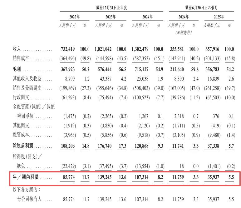 2022年、2023年、2024年以及2025年上半年,公司营业收入分别约为7.32亿元、10.21亿元、13.02亿元、6.58亿元;毛利润分别约为3.68亿元、5.76亿元、7.15亿元及3.57亿元,毛利率分别约为50.2%、56.5%、54.9%及54.2%。