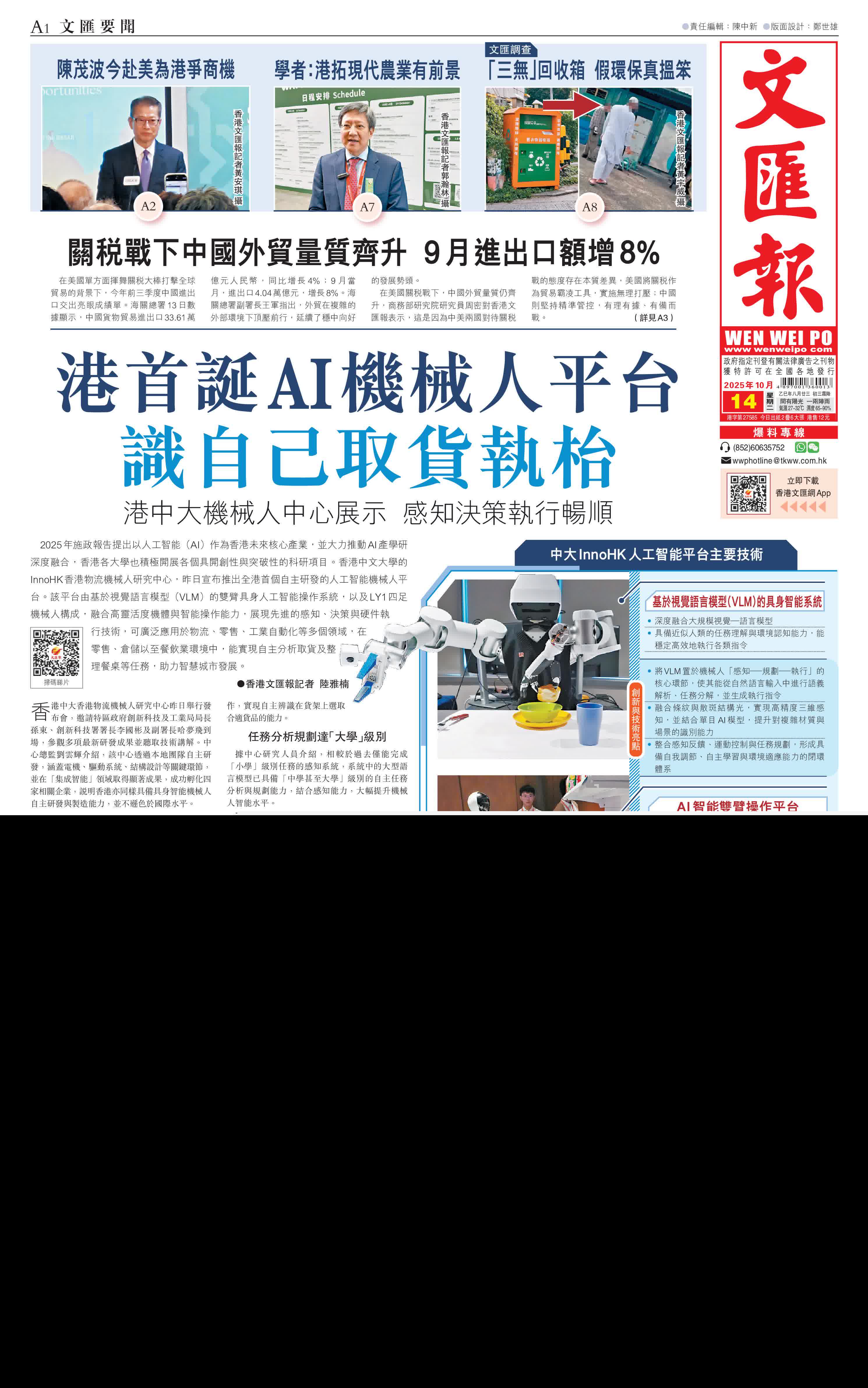 (香港文匯報記者 陸雅楠)2025年施政報告提出以人工智能(AI)作為香港未來核心產業,並大力推動AI產學研深度融合,香港各大學也積極開展各個具開創性與突破性的科研項目。香港中文大學的InnoHK香港物流機械人研究中心,昨日宣布推出全港首個自主研發的人工智能機械人平台。該平台由基於視覺語言模型(VLM)的雙臂具身人工智能操作系統,以及LY1四足機械人構成,融合高靈活度機體與智能操作能力,展現先進的感知、決策與硬件執行技術,可廣泛應用於物流、零售、工業自動化等多個領域,在零售、倉儲以至餐飲業環境中,能實現自主分析取貨及整理餐桌等任務,助力智慧城市發展。