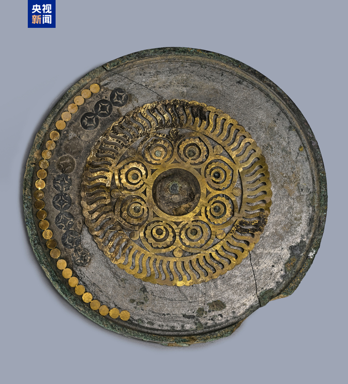 墓葬出土的金银平脱镜,直径15.4厘米、厚0.46厘米,圆形,半球形钮,镜背贴布髹漆,围绕镜钮最内层为八瓣心形金片宝相花纹,每瓣为三重,最内重中心处为绿色玻璃珠;宝相花纹外为一周镂空曲栉齿环带;最外层为一周银片圆形方孔钱纹和一周金片联珠纹。